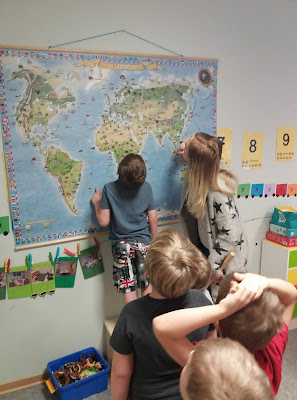 Alustasime enda nĂ€dalat maailmakaardi ja gloobuse uurimisega: lapsed otsisid koos Ă”petajaga riike, mis neile huvi pakuvad (Egiptus, Soome, Rootsi, Austraalia) ja ĂŒheskoos otsisime ĂŒles ka oma kodumaa Eesti. ❤